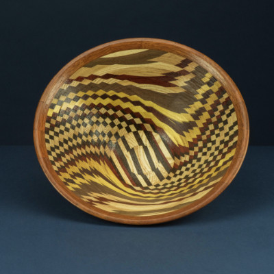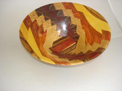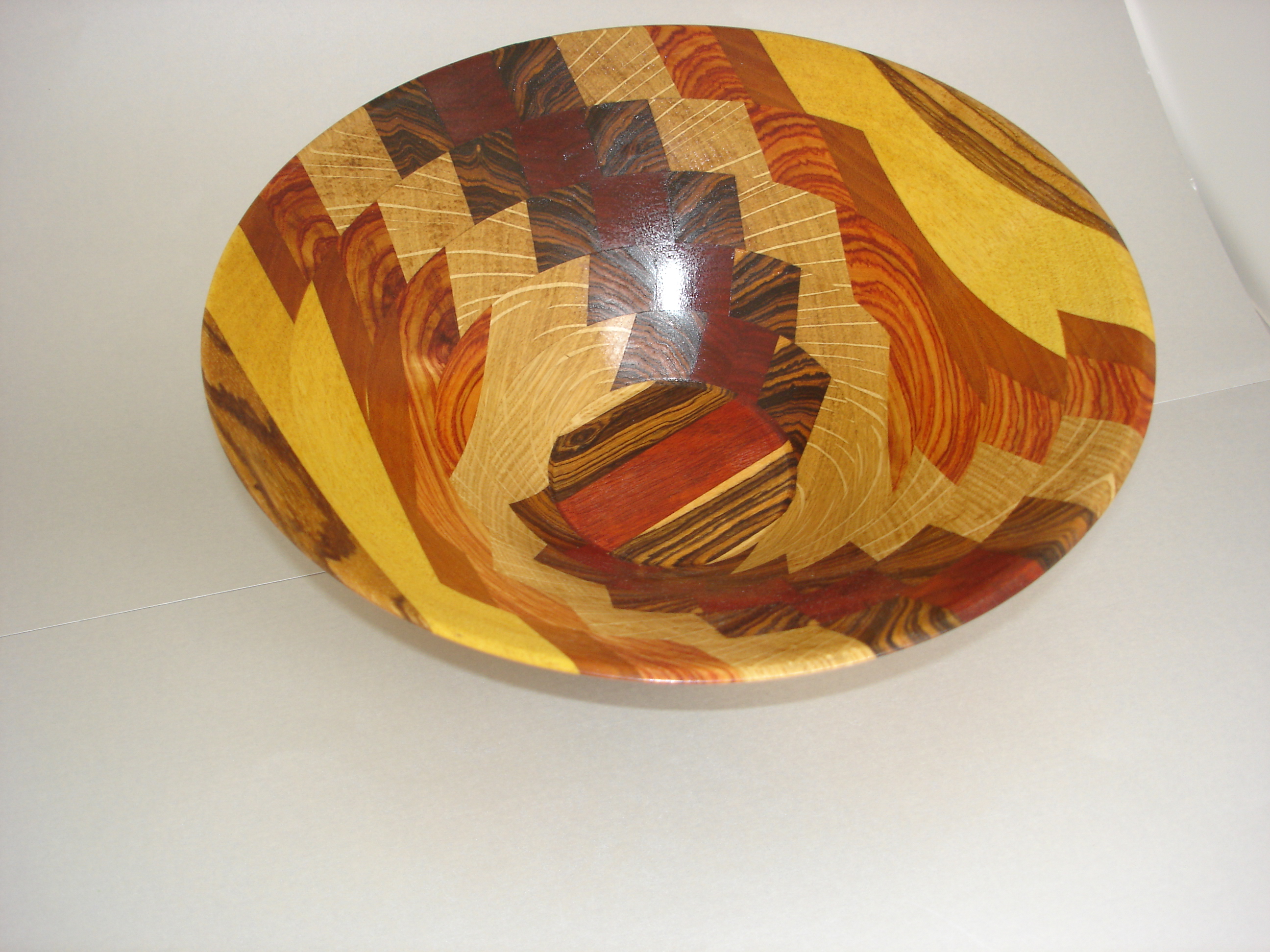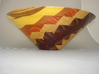 Bowl from 3/4 inch strips of Zebrawood, Yellowheart, Cherry, Olivewood, Oak, Rosewood, and Bloodwood (side view).