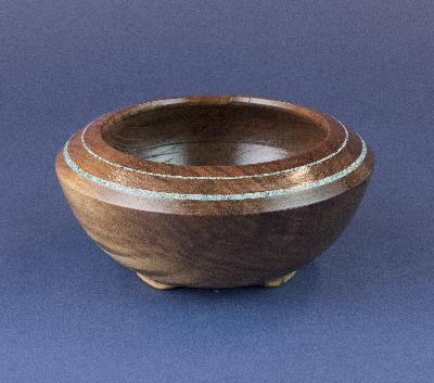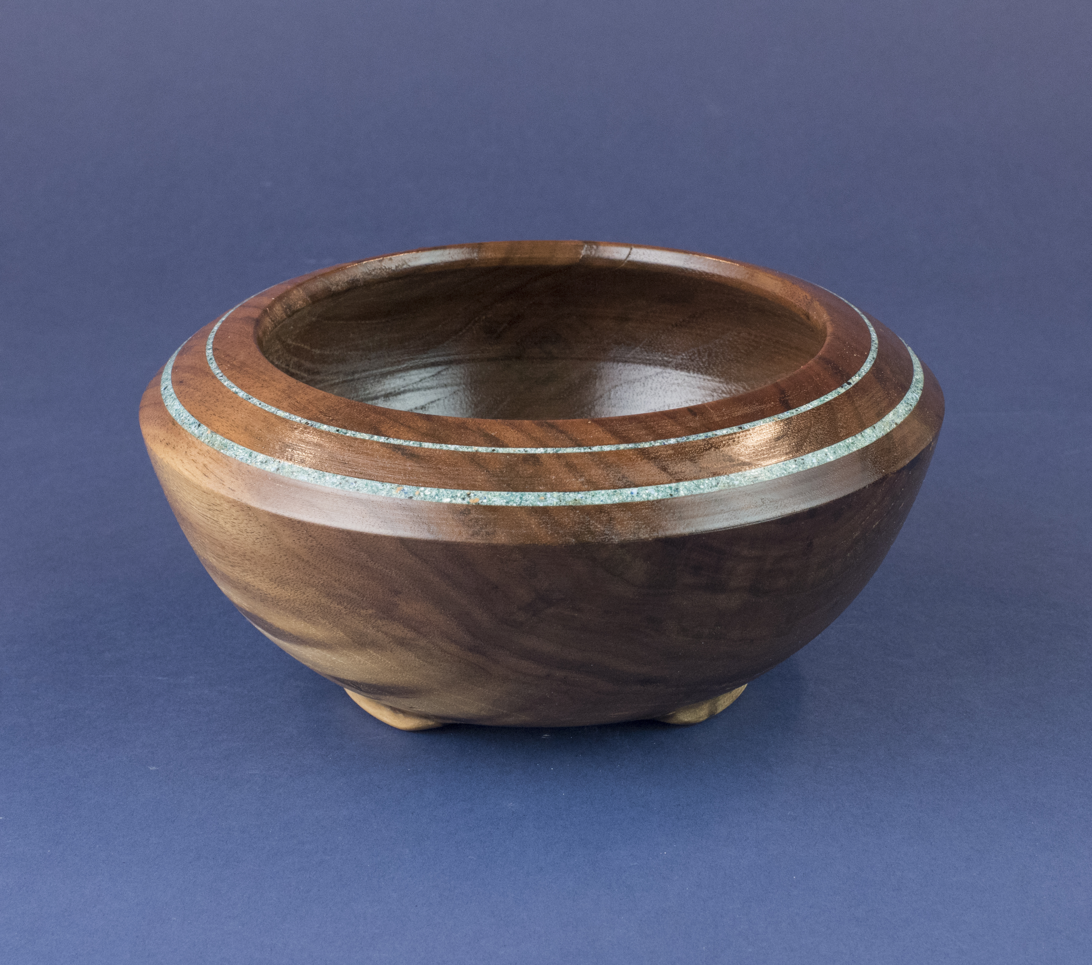 Turned Walnut bowl with inlayed turquoise and carved feet.