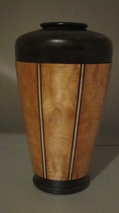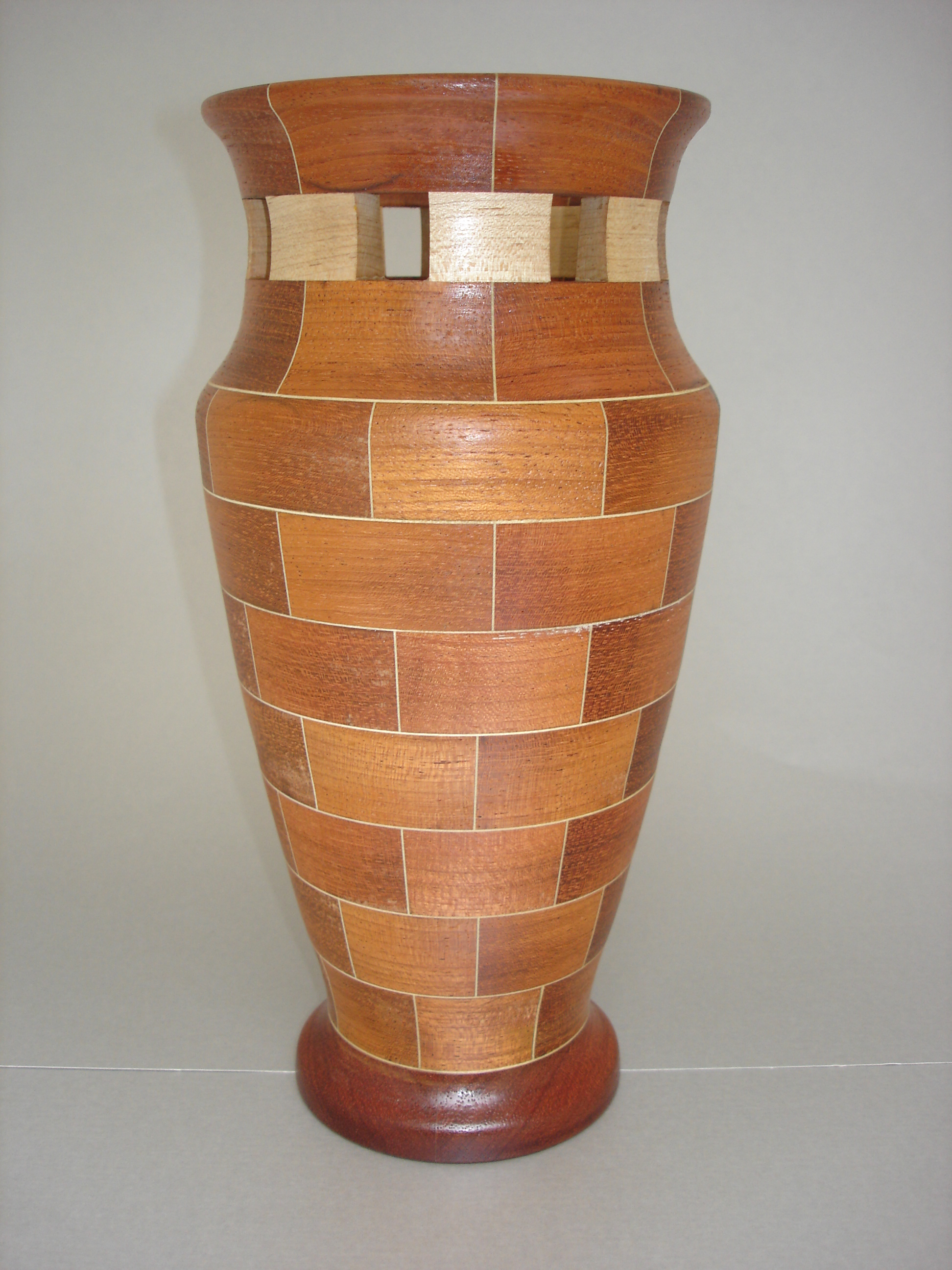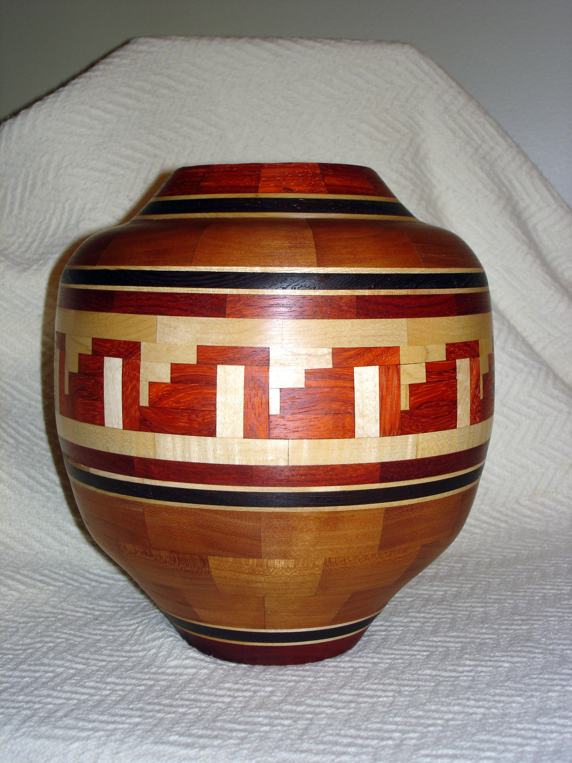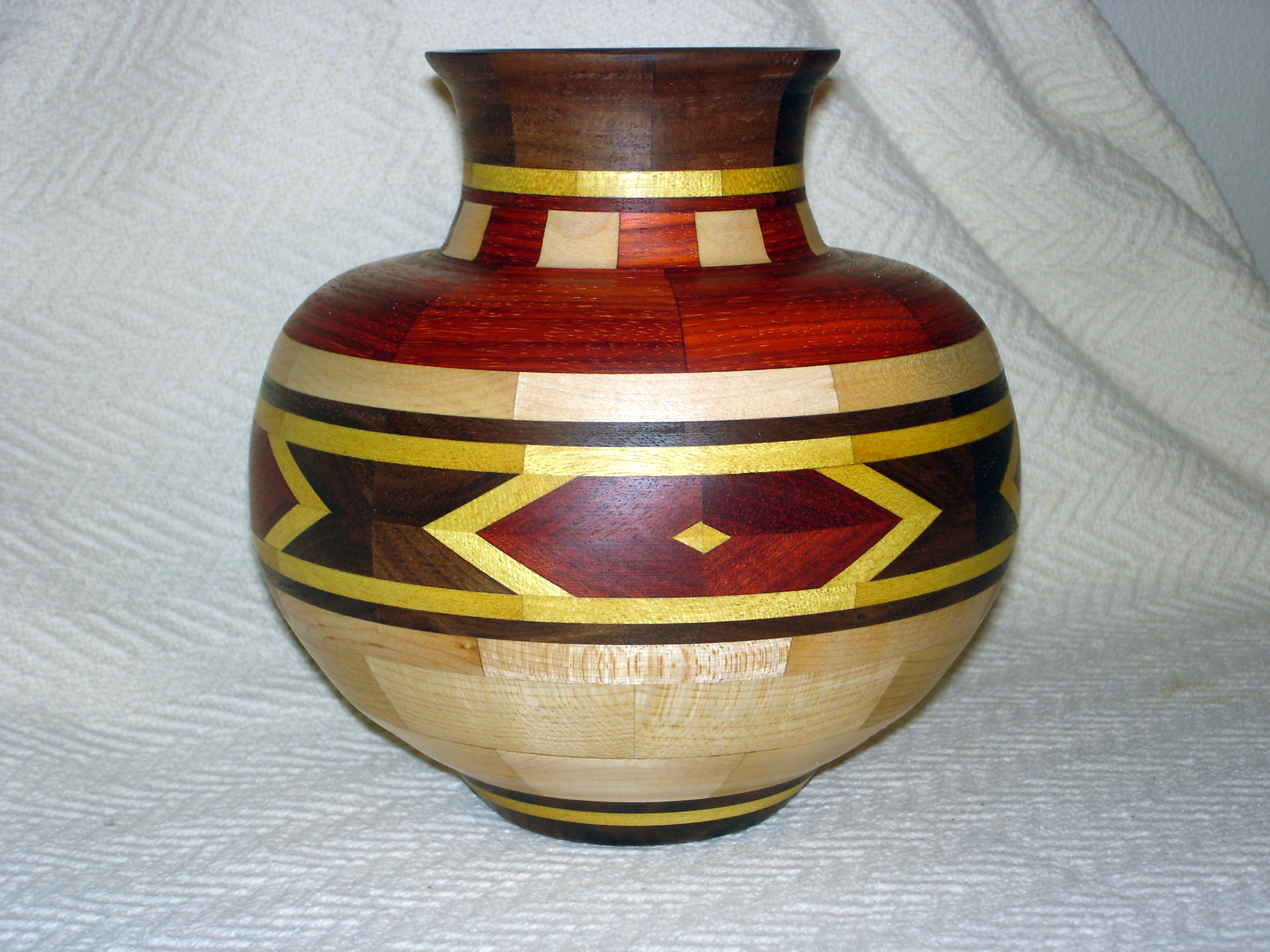 15 inch tall and 11 inch diameter segmented vase from Paduk, Maple, Walnut, and Ash. 2010