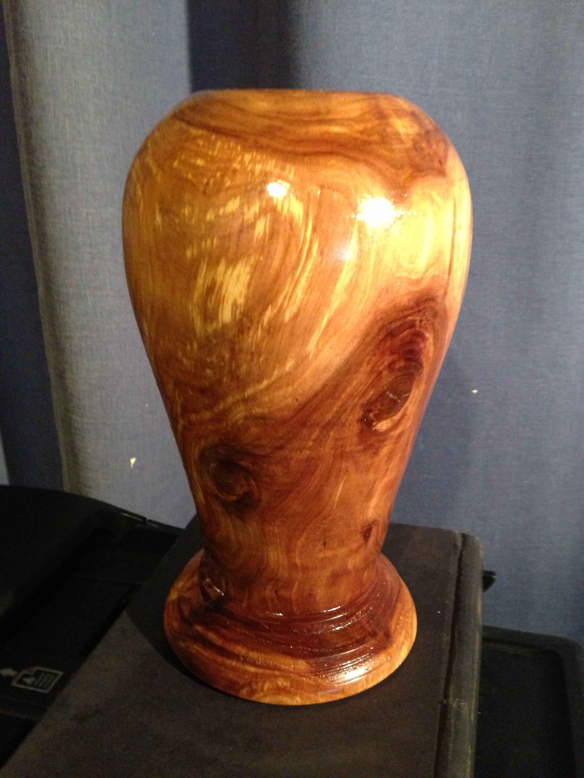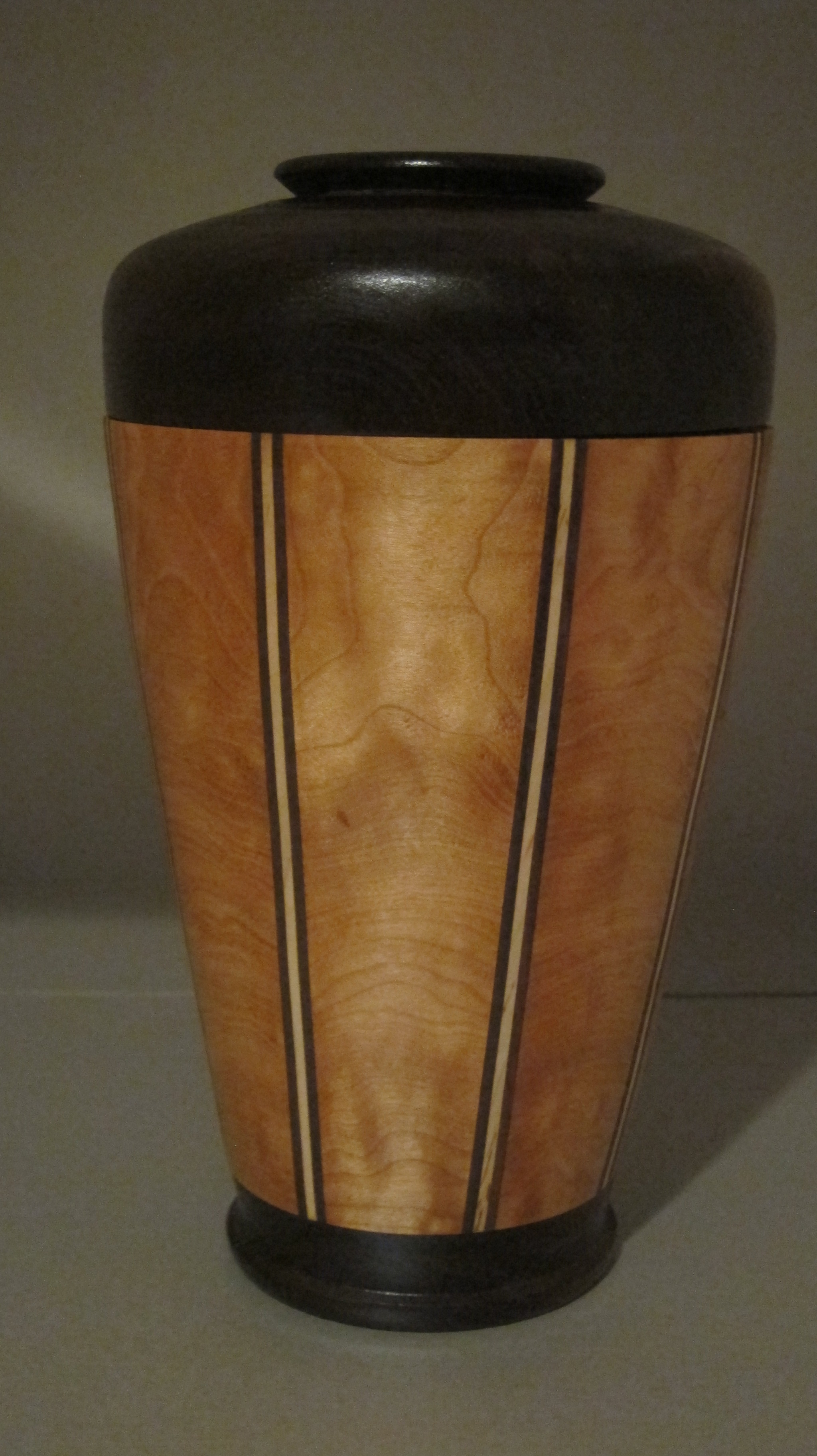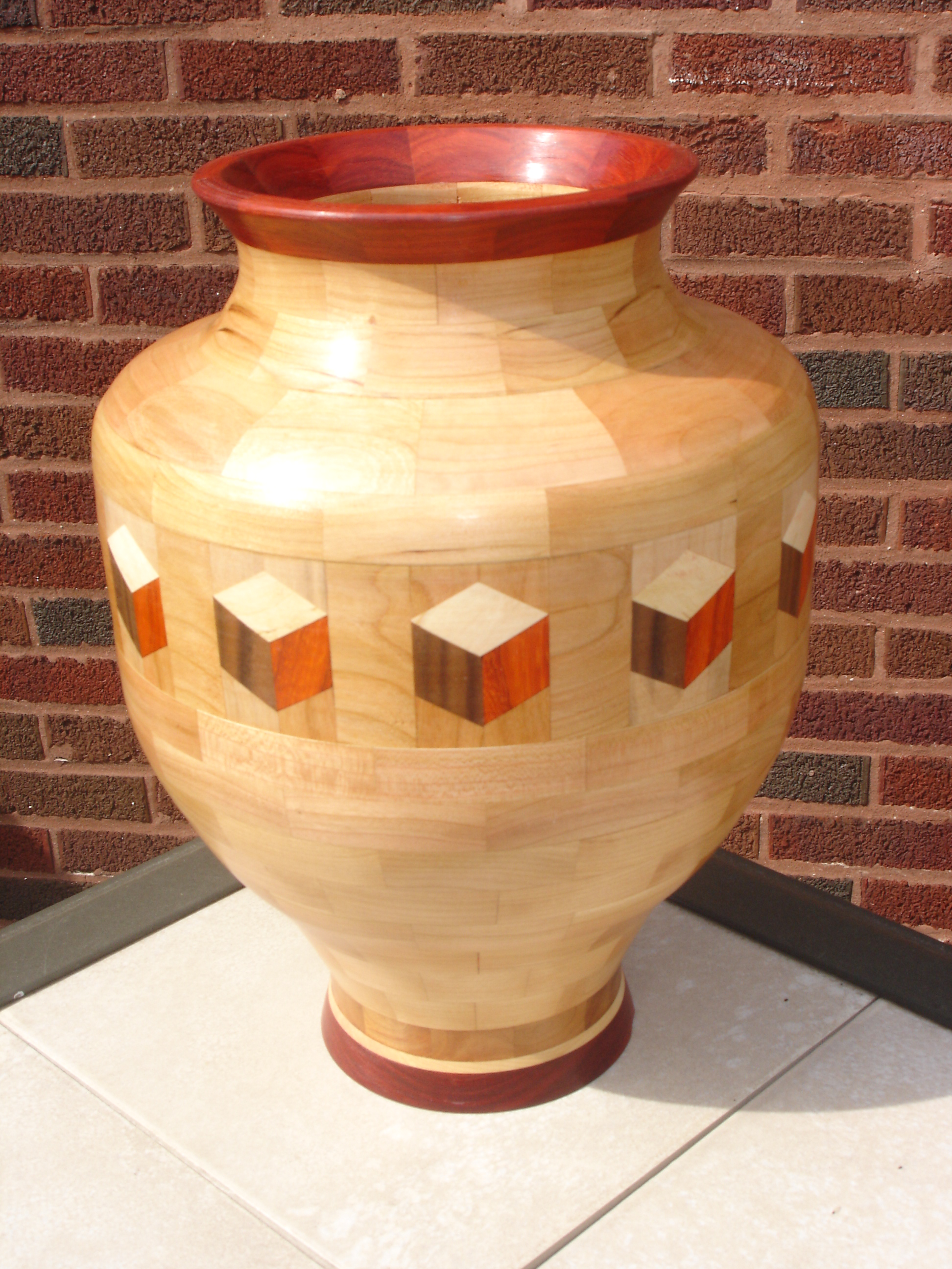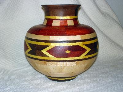 15 inch tall and 11 inch diameter segmented vase from Paduk, Maple, Walnut, and Ash. 2010