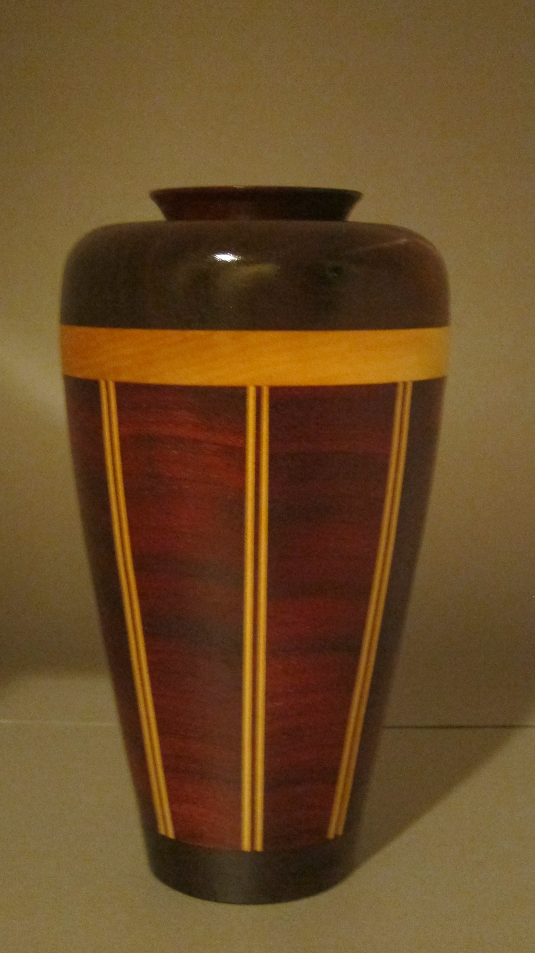 Segmented vase from Paduk, Yellowheart, and Rosewood. 20114