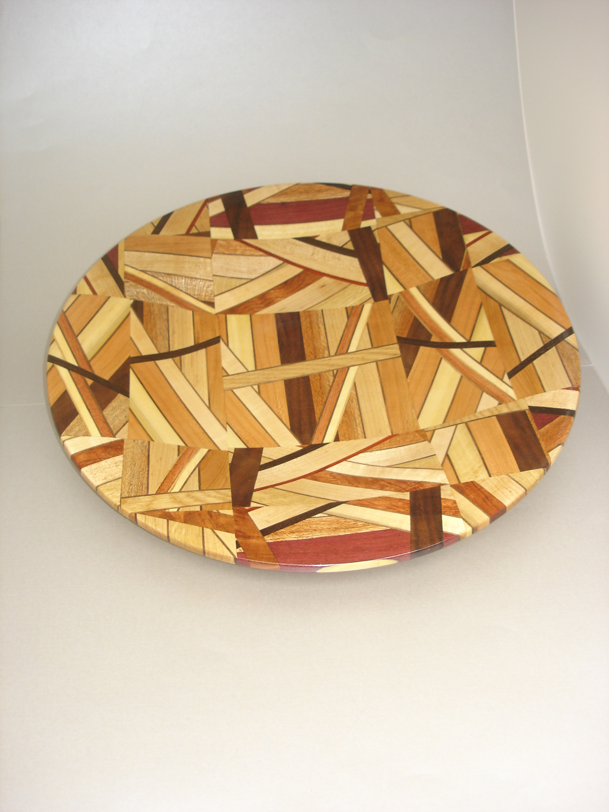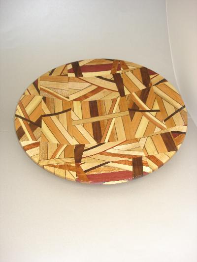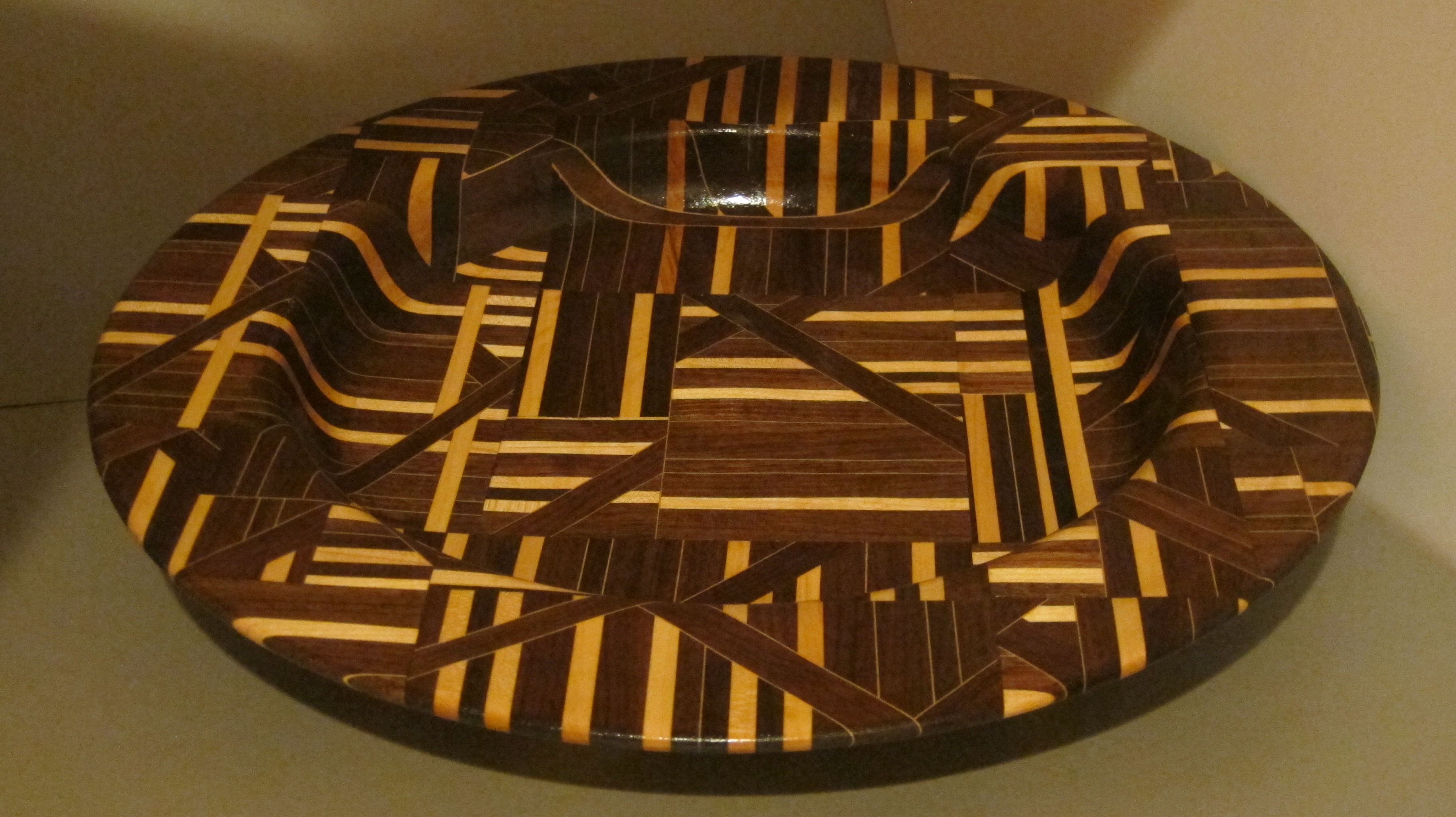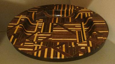 Bowl from 3/4 inch strips of Zebrawood, Yellowheart, Cherry, Olivewood, Oak, Rosewood, and Bloodwood (top view).