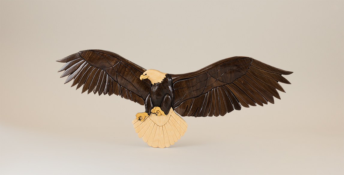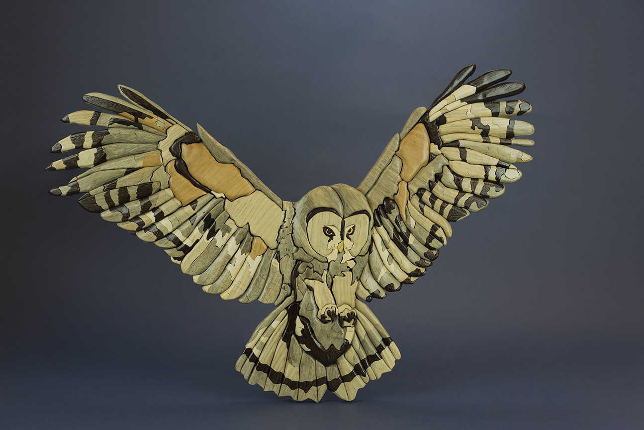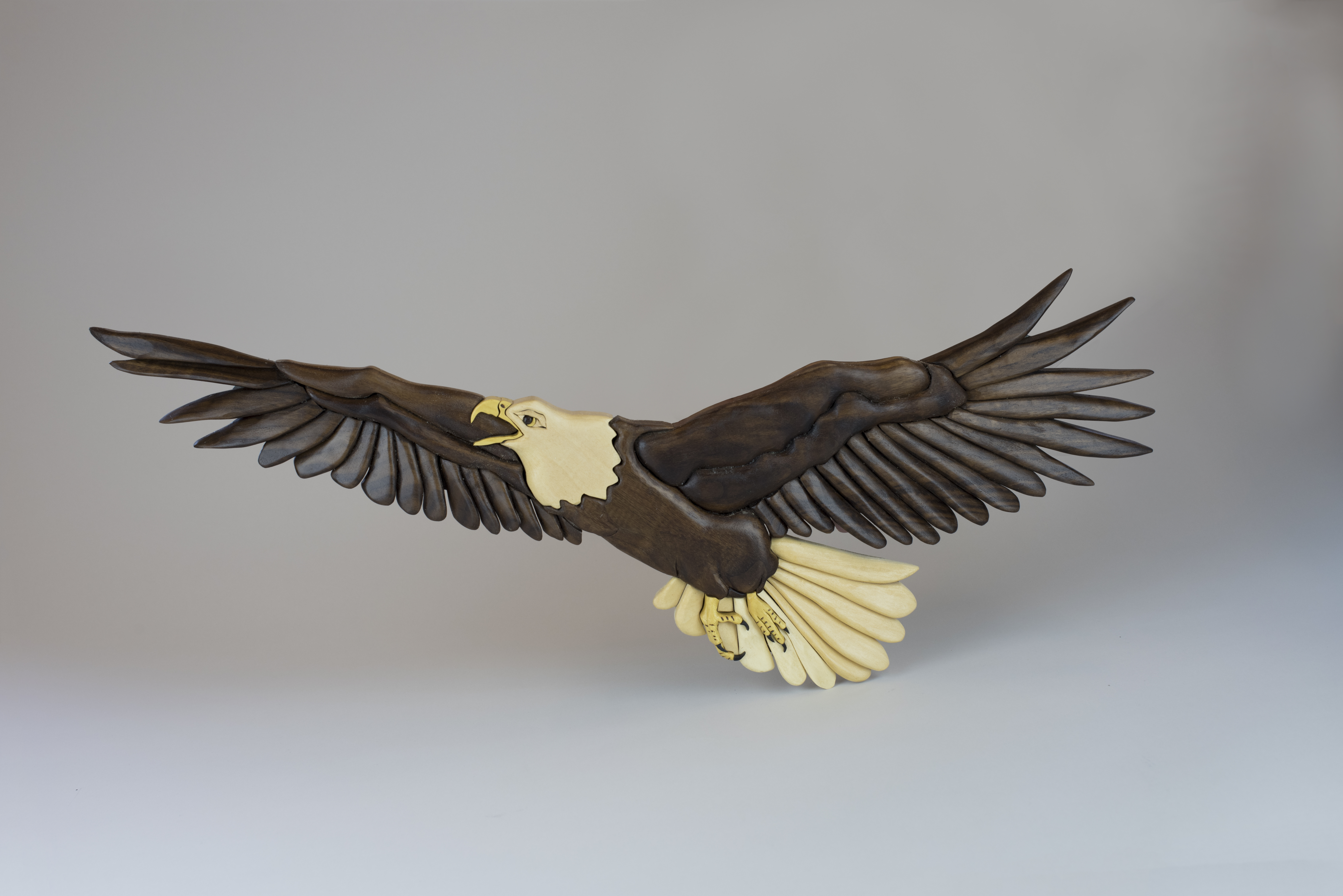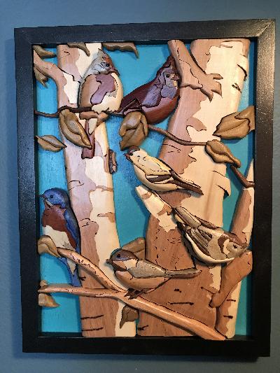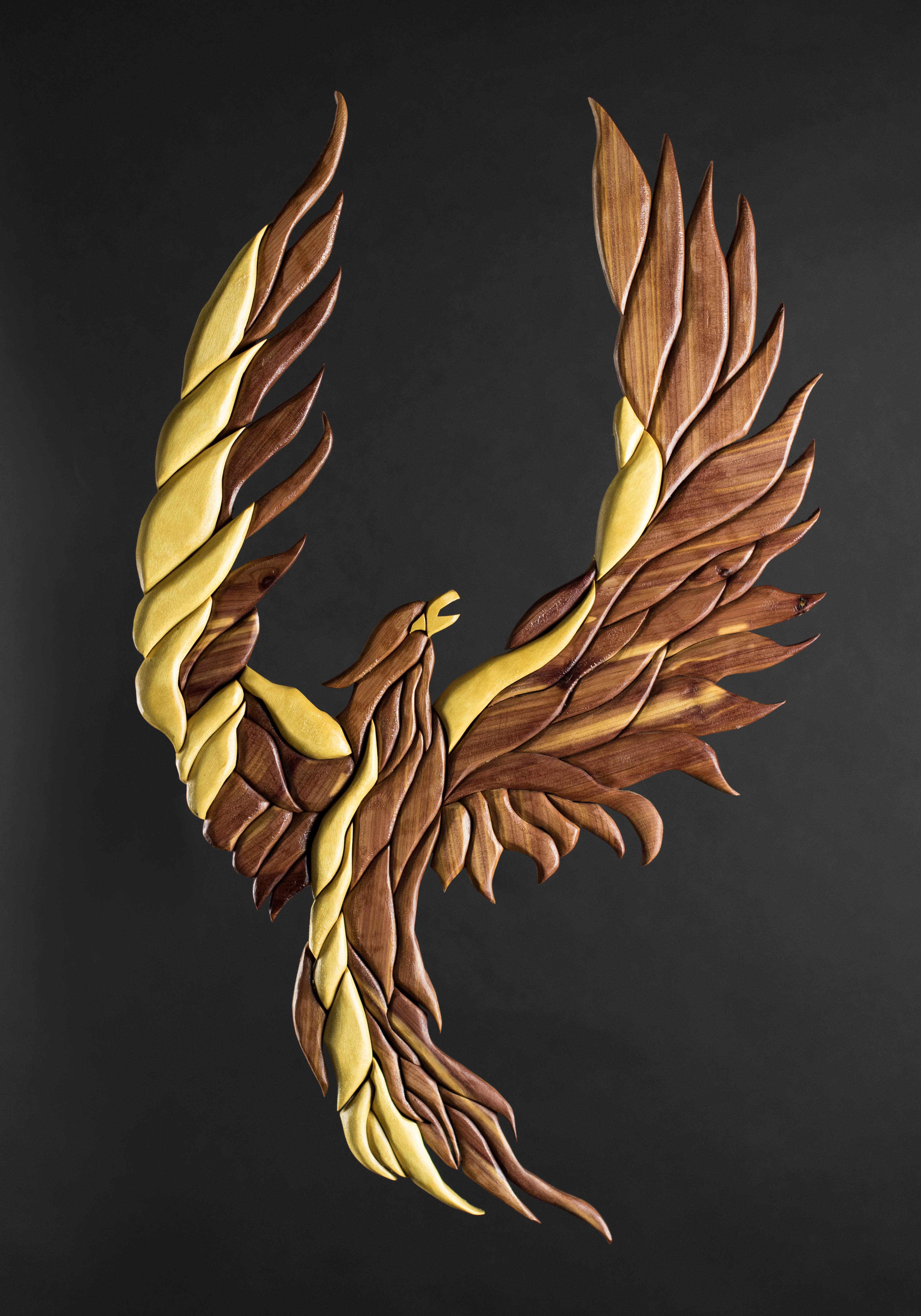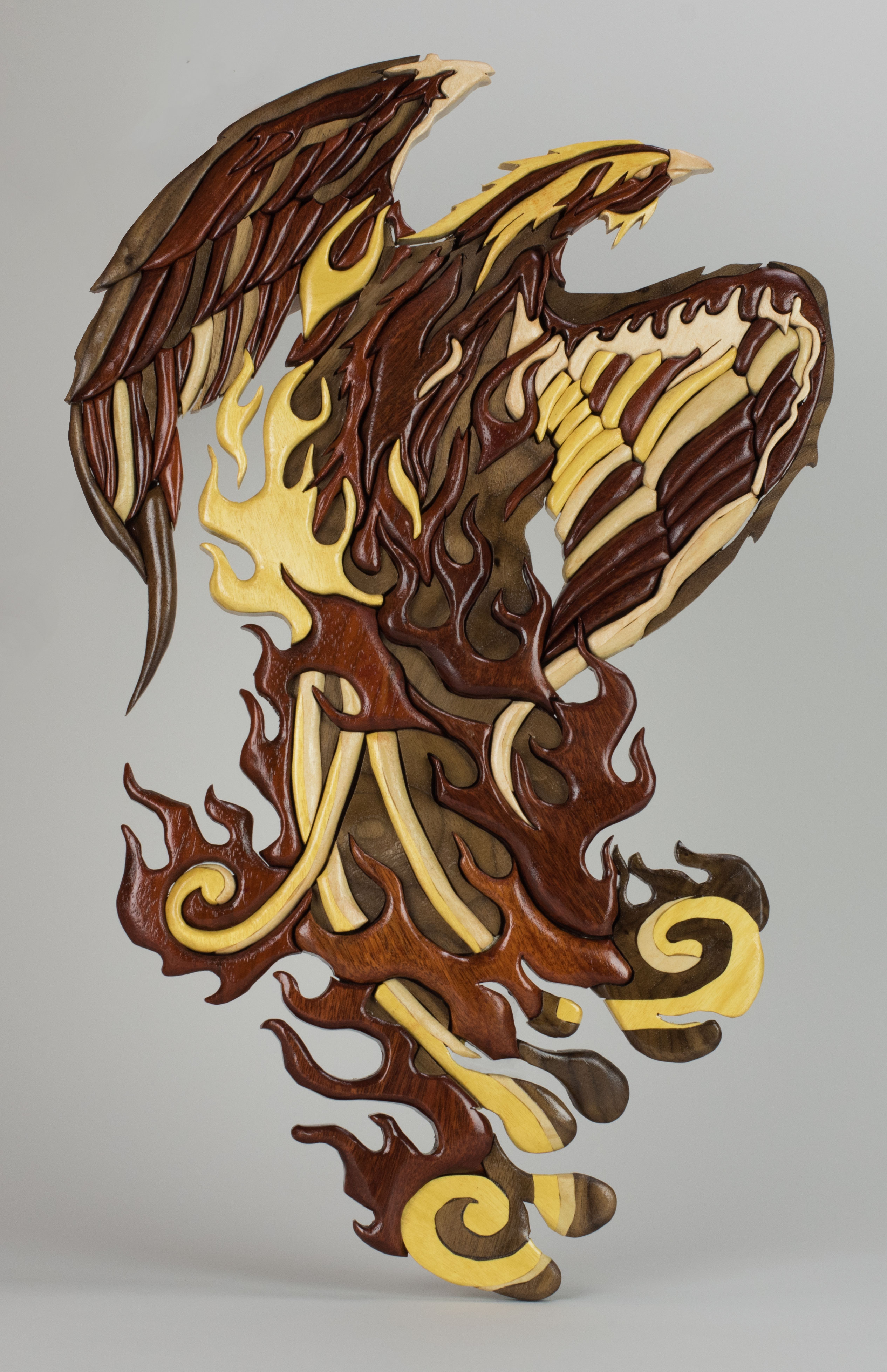 73 piece Phoenix intarsia using a pattern from Bruce Worthington at www.intarsia.com. Woods are Aromatic Cedar and Yellowheart. 2015