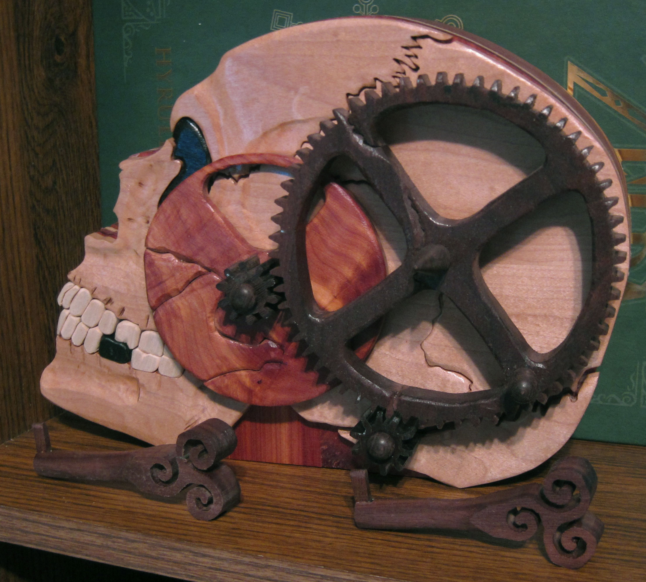 Steam Punk style box. Black tooth is pulled out and used to slide a hidden pin freeing the gears to spin revealing a key hole. The keys can then open the box which slides out from behind the skull.