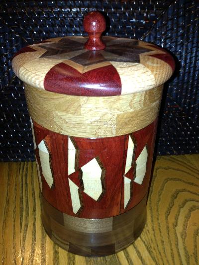 Canister with Bird segments. Woods include Walnut, Oak, Maple, Wenge, and Bloodwood. 2013